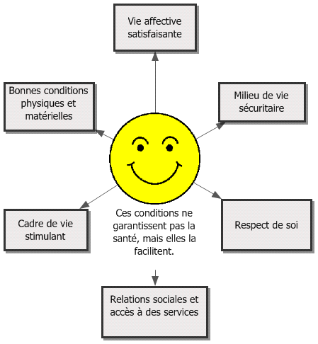 La santé à elle seule ne fait pas le bonheur. On peut être en santé et se sentir mal dans sa peau ou dans son milieu, être mécontent de son sort. La santé n’élimine pas non plus les défis normaux de la vie. Mais elle nous donne le moyen d’y faire face et de poursuivre les objectifs qui nous sont chers.